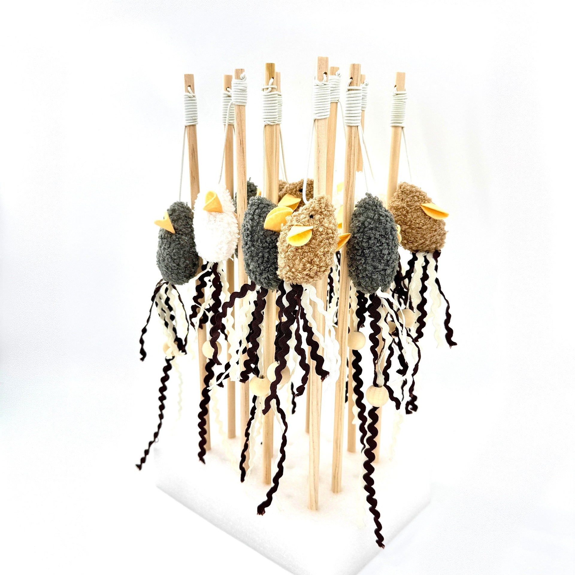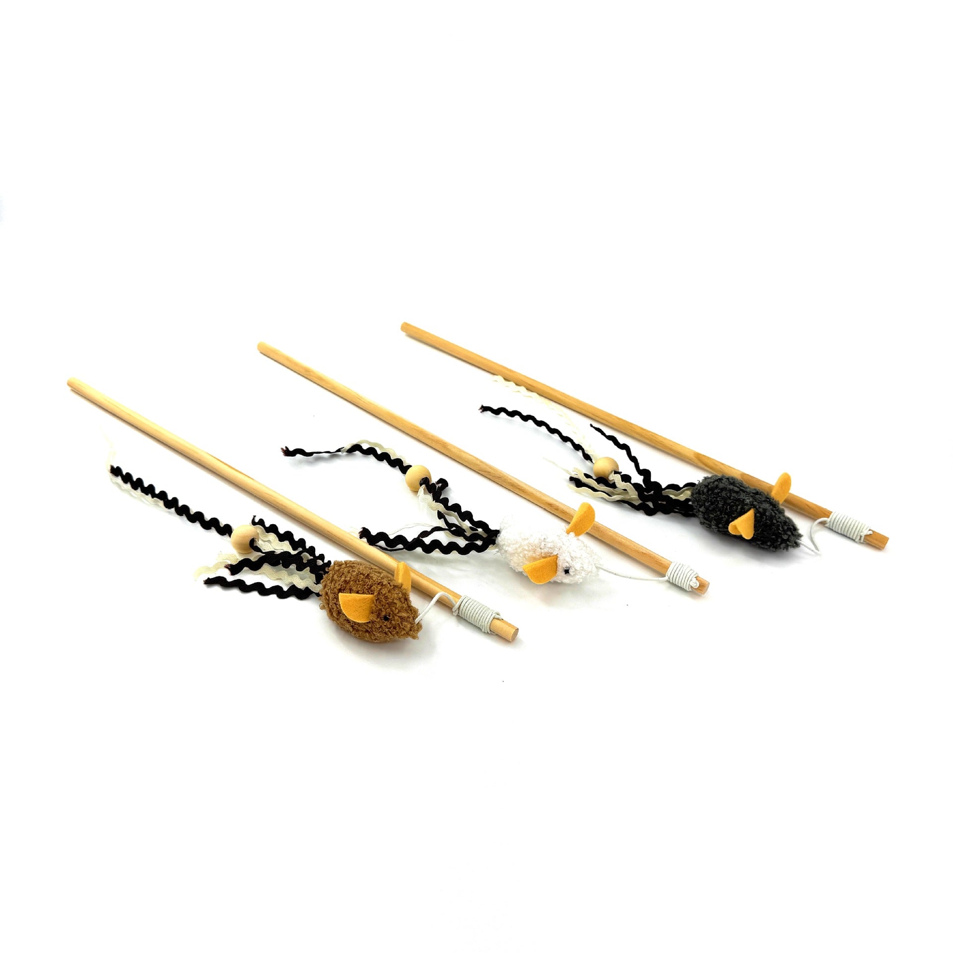 Three mice, one mission: to charm, tease, and delight. The Fuzzy Mouse Cat Teaser Wand features a soft plush mouse topper in brown, white, or charcoal, with trailing cords and wooden bead accents that bounce with every flick. Built for chase, tap, and interactive fun.