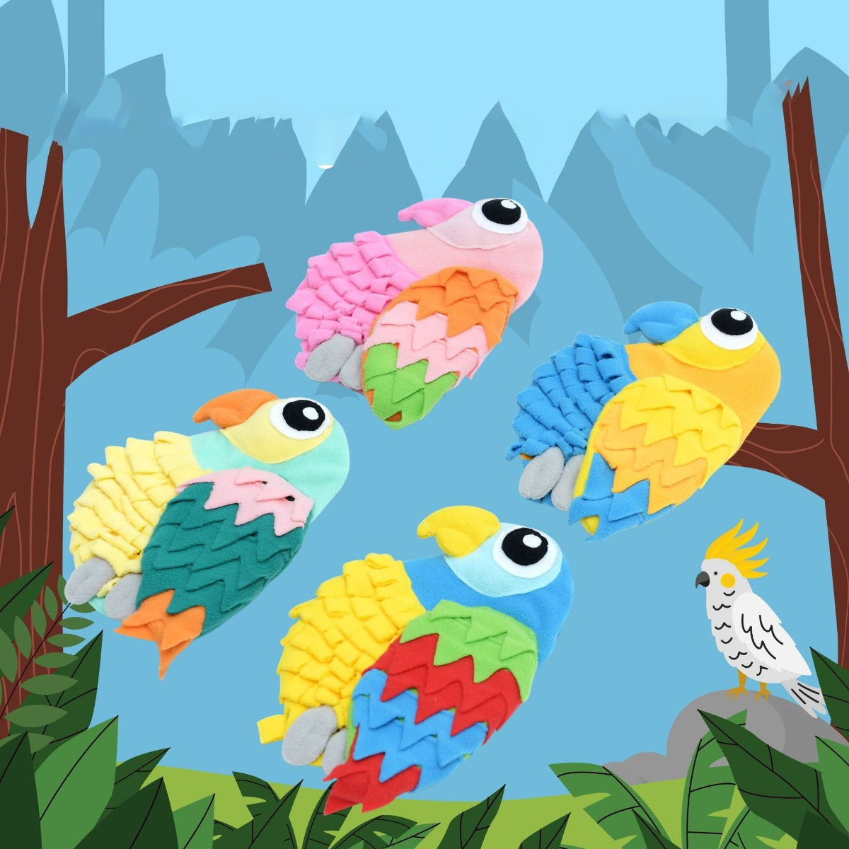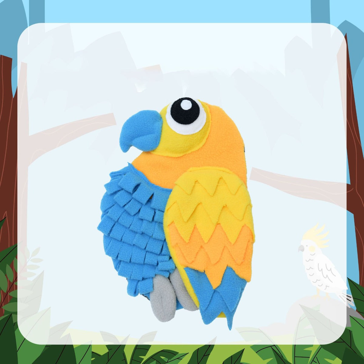 • Bright parrot shape with layered wings for treat hiding