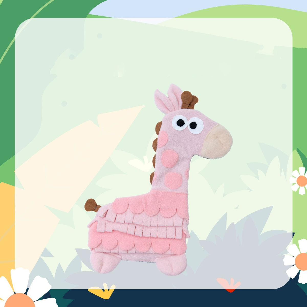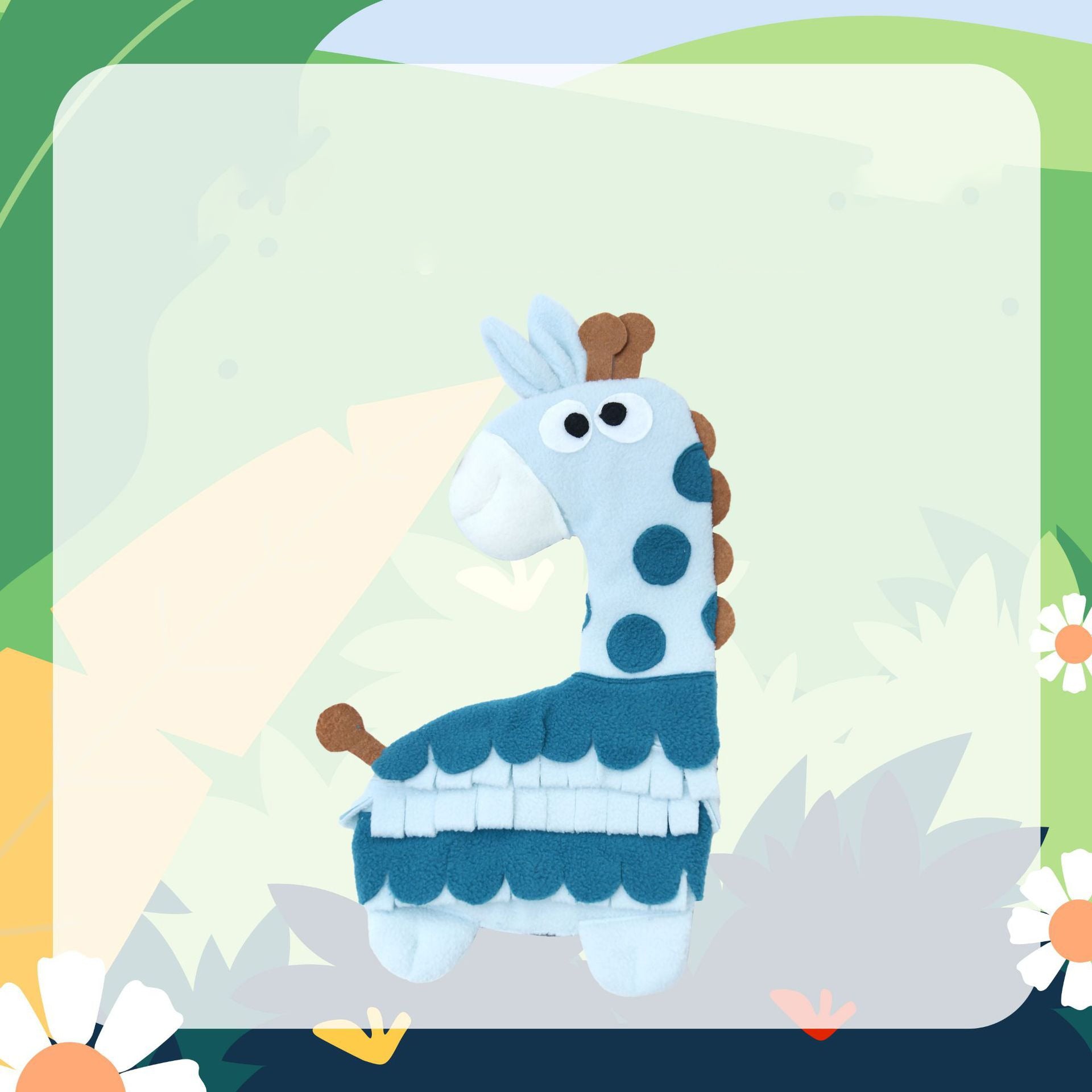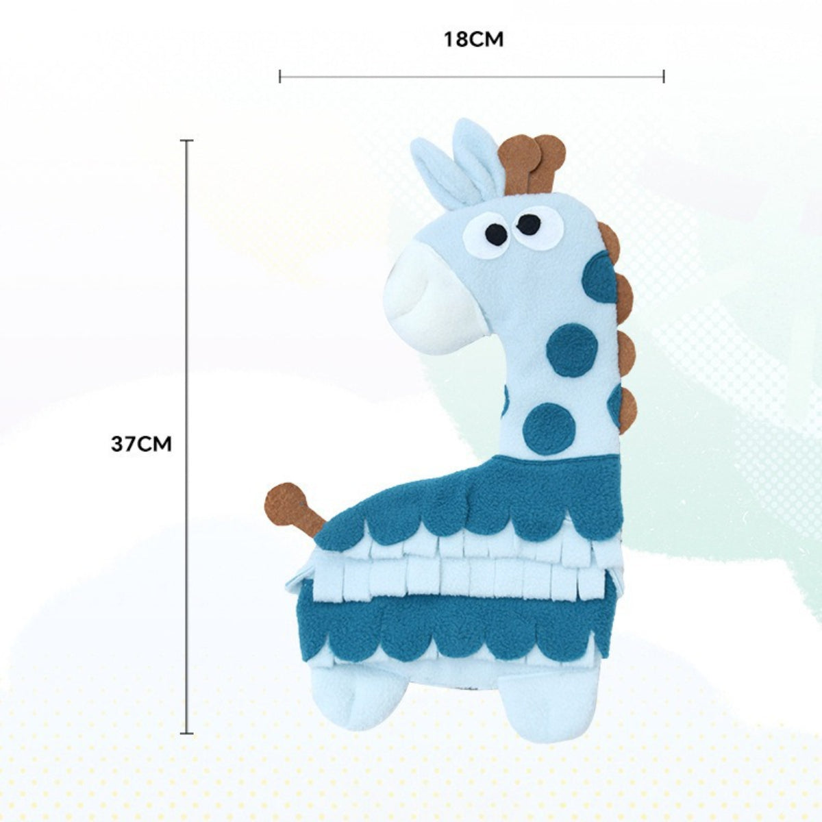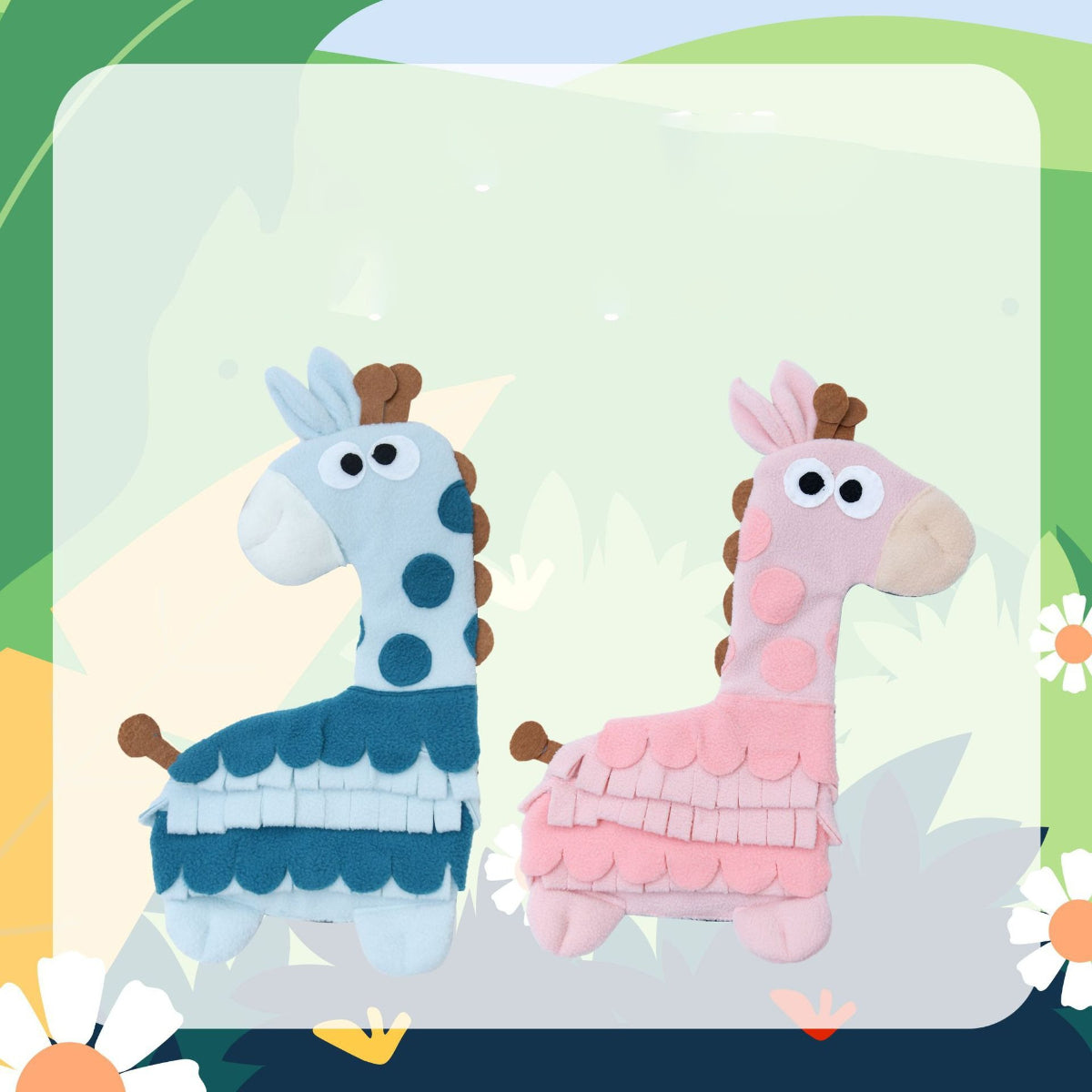Bright, soft, and designed for enrichment—this giraffe-shaped snuffle toy is made to spark your dog’s curiosity and reward natural foraging. Its layered felt “fur” conceals small treats, inviting sniffing, nudging, and play.